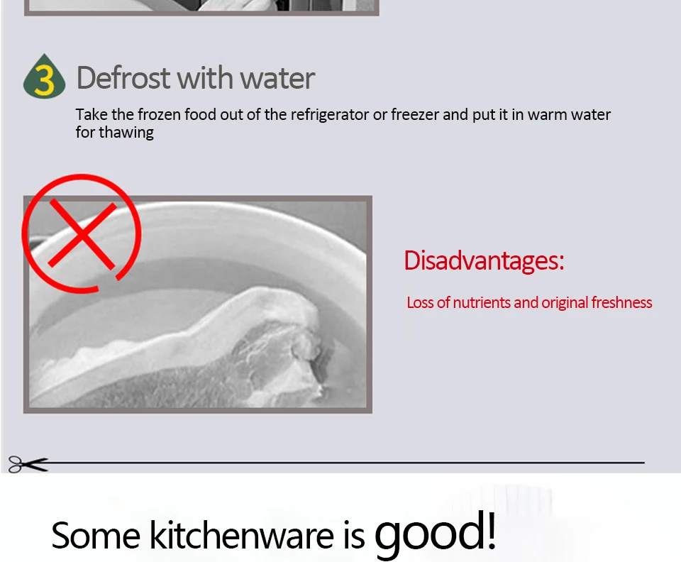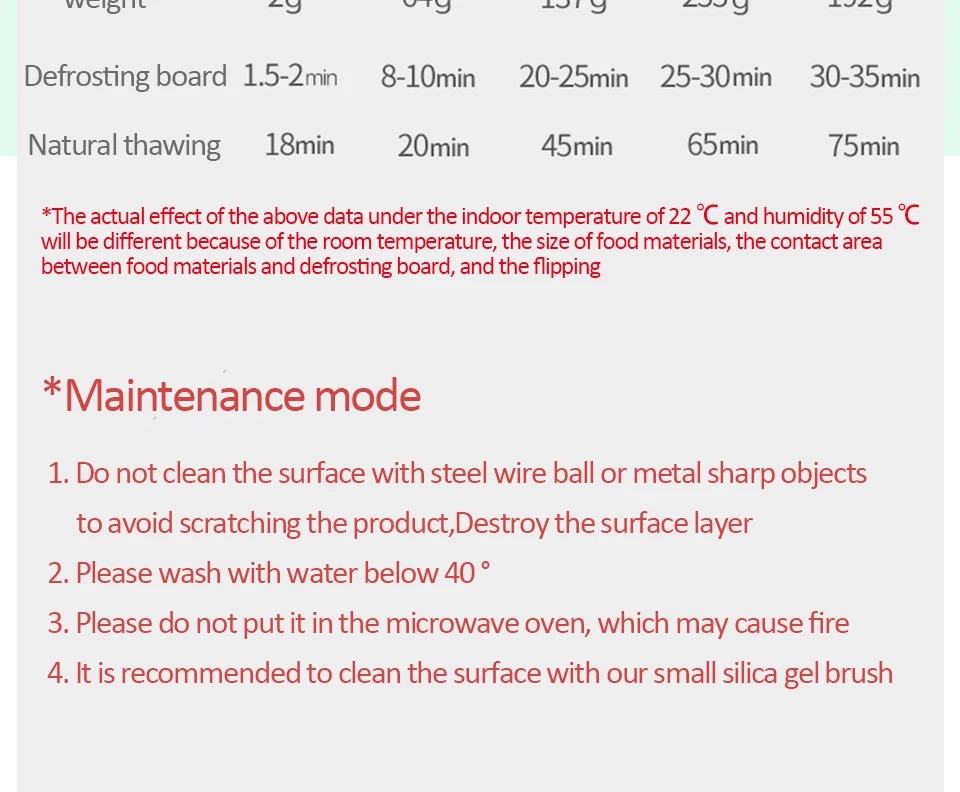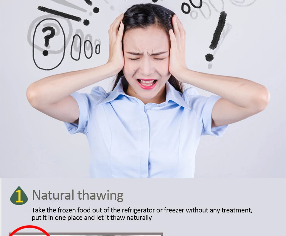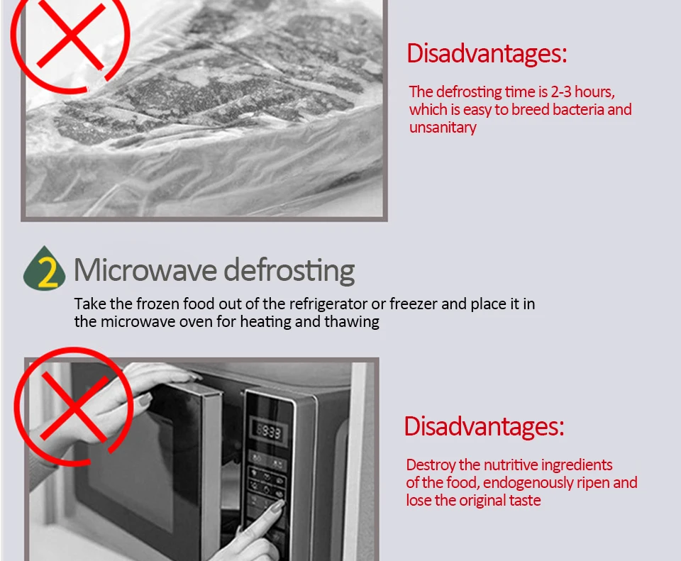4. Absolument aucun produit chimique ni électricité n’est utilisé.Contrairement aux fours à micro-ondes qui cuisent partiellement les aliments pendant le processus de décongélation, le plateau décongèle la viande en toute sécurité et rapidement ;
